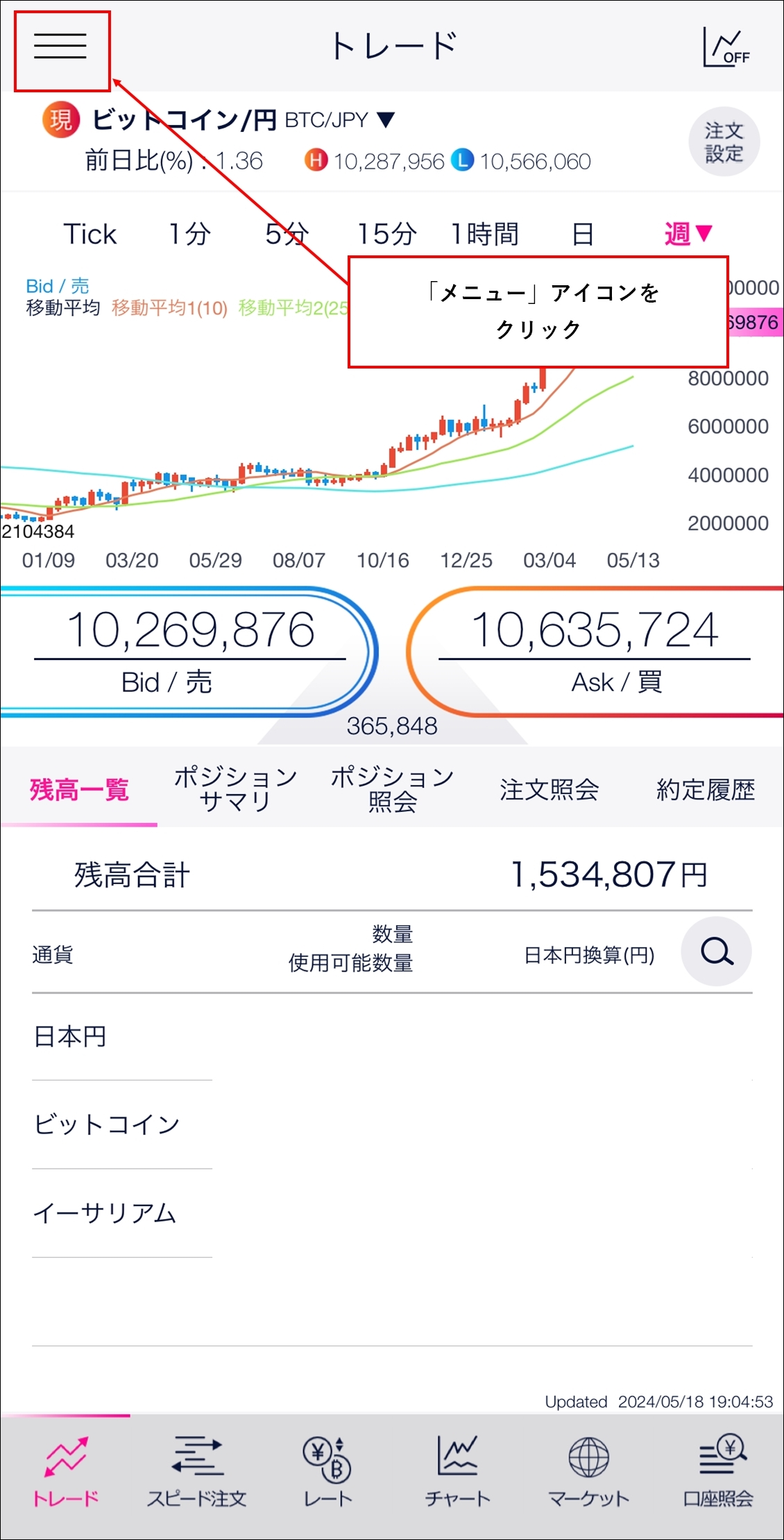 「DMM Bitcoin」アプリの画面から、左上のメニューをタップ(クリック)します。