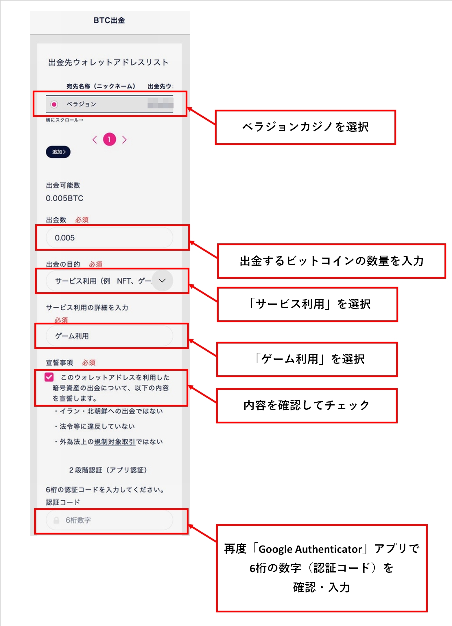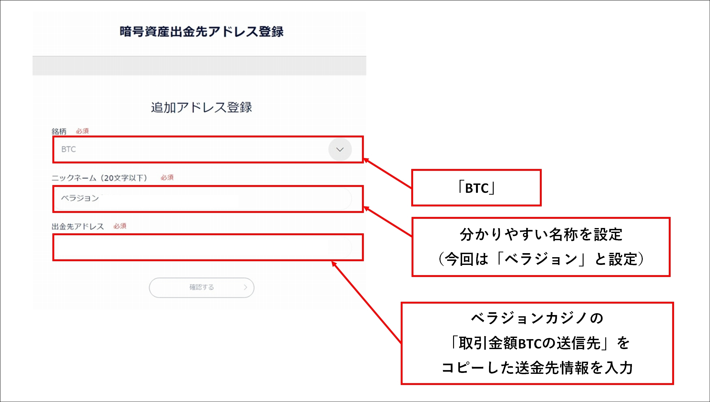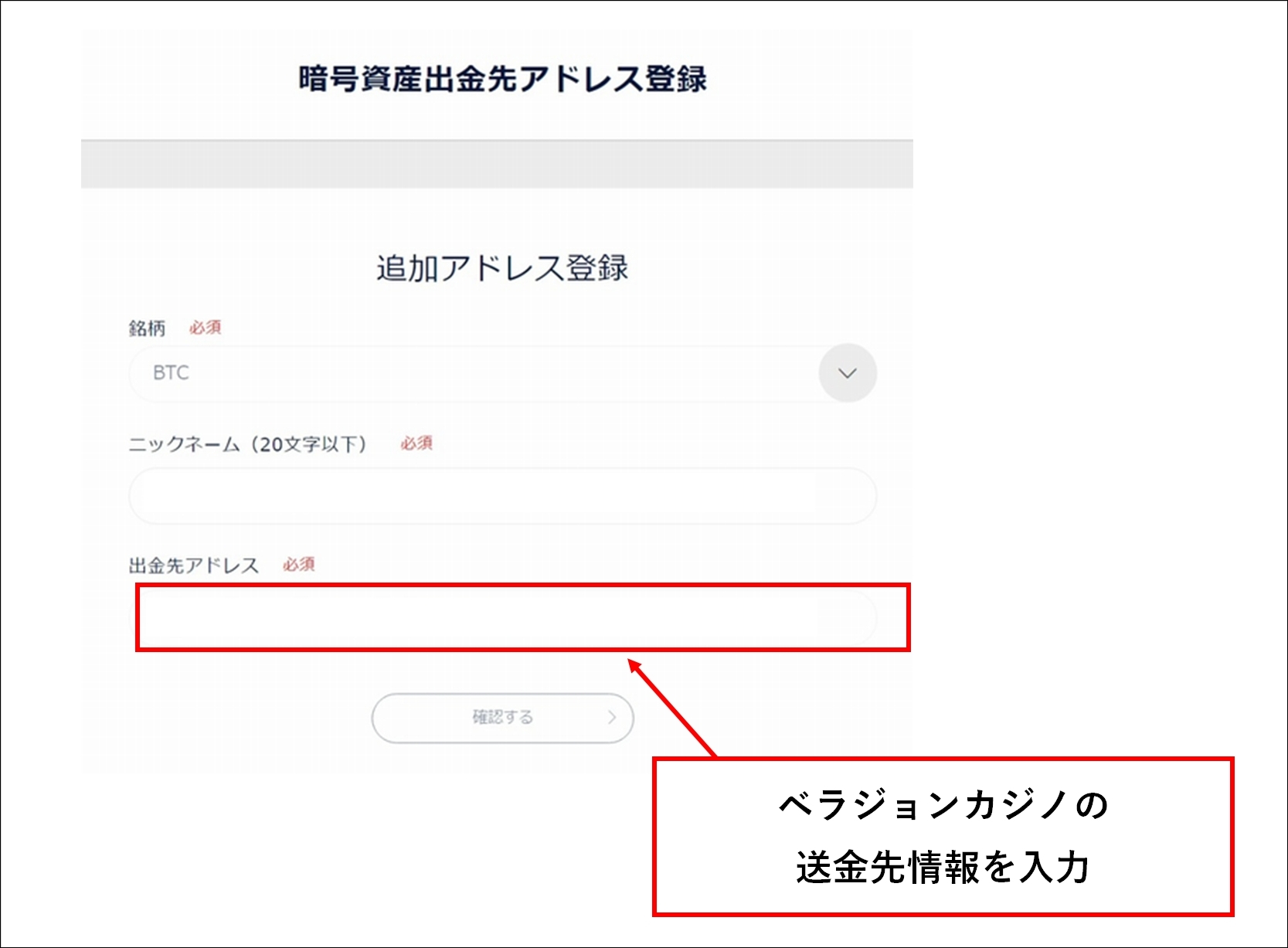 ・出金先アドレス:ベラジョンカジノの「取引金額BTCの送信先」をコピーしたアドレスを貼り付けます。
