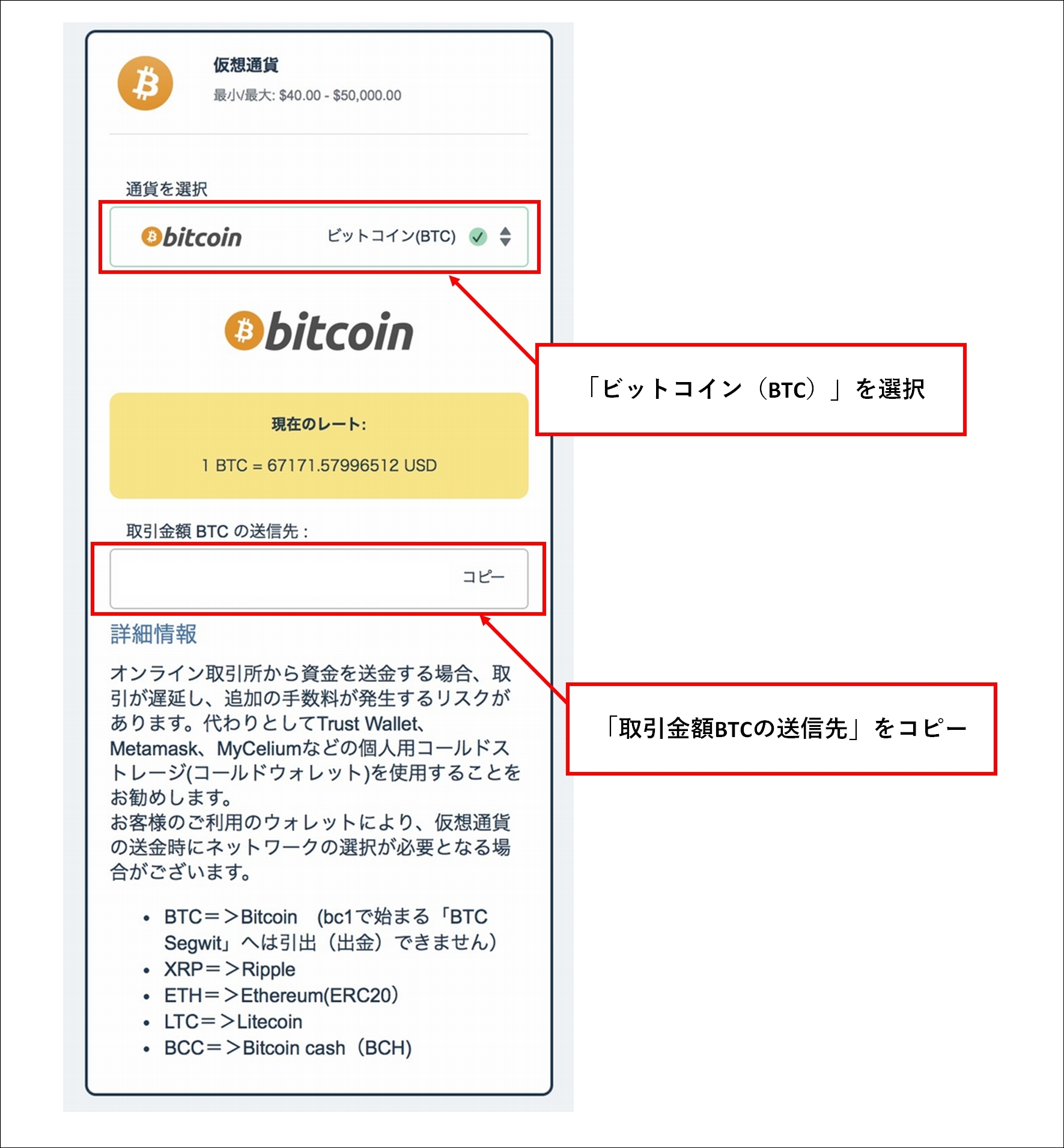 ビットコイン(BTC)を選択すると、現在のレートとビットコインの送信先が表示されます。