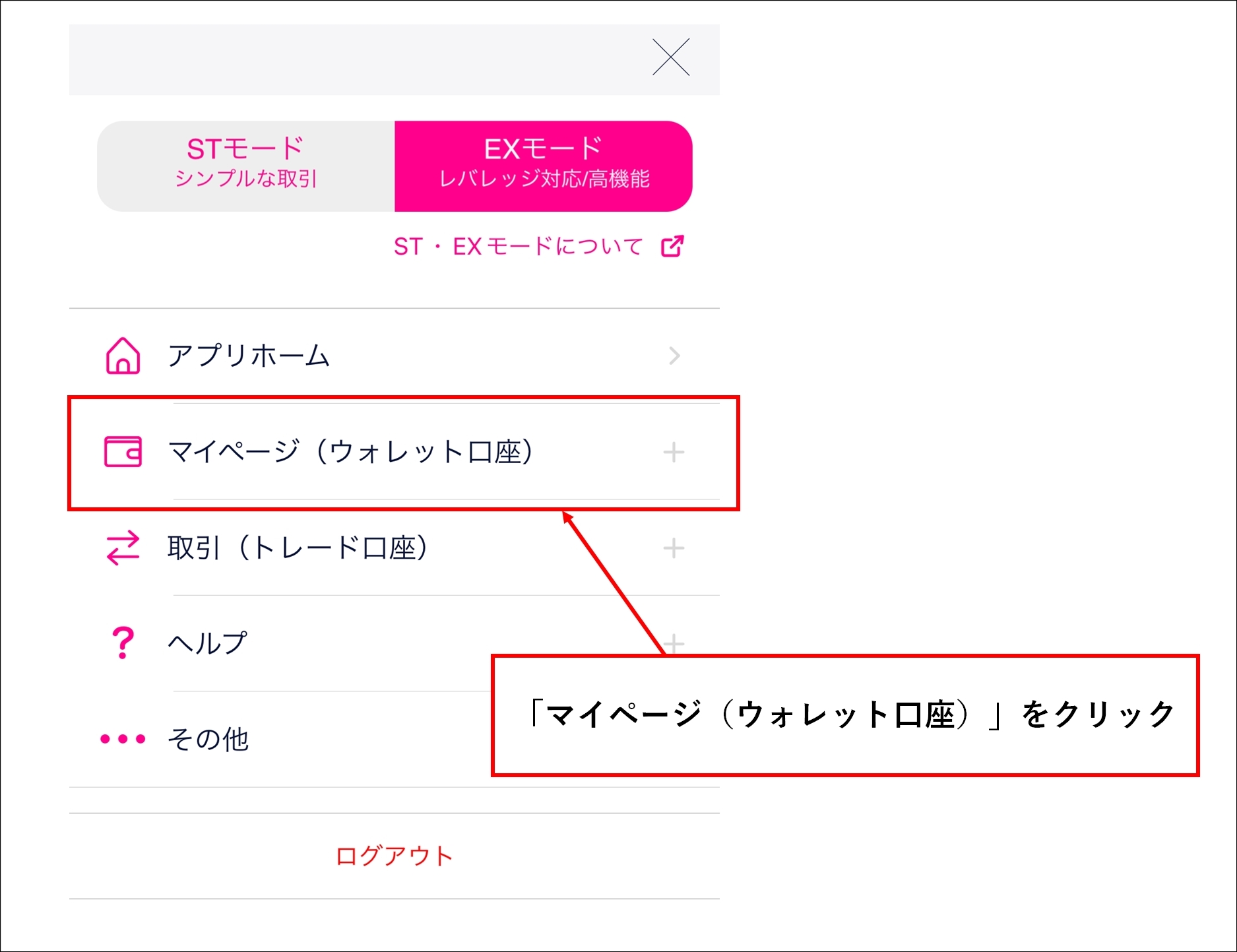 メニュー画面から、「マイページ(ウォレット口座)」をタップ(クリック)します。