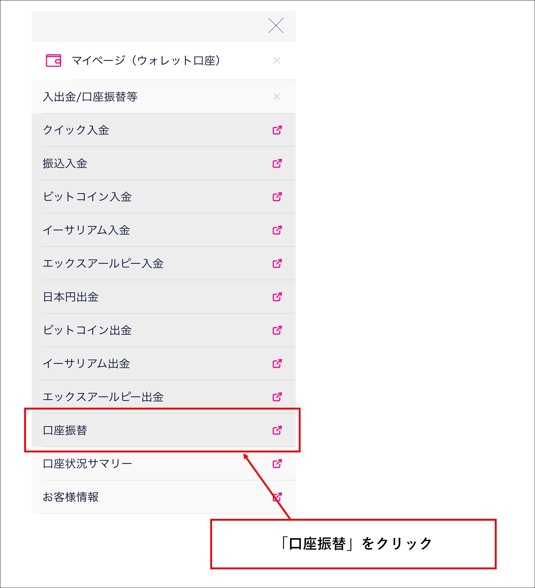 「マイページ(ウォレット口座)」部分が展開したら、「口座振替」をタップ(クリック)