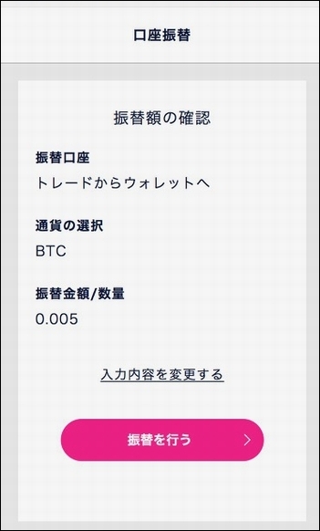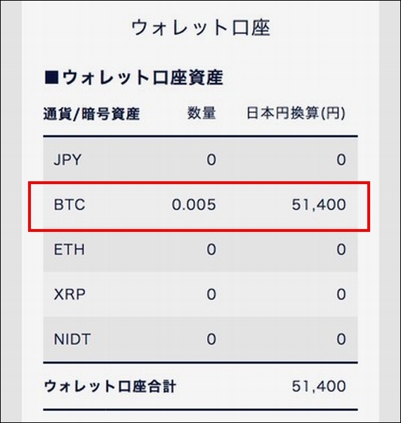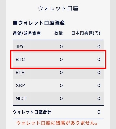 「トレード口座」の残高になっているため、「ウォレット口座」のビットコイン残高は「0」になっています。