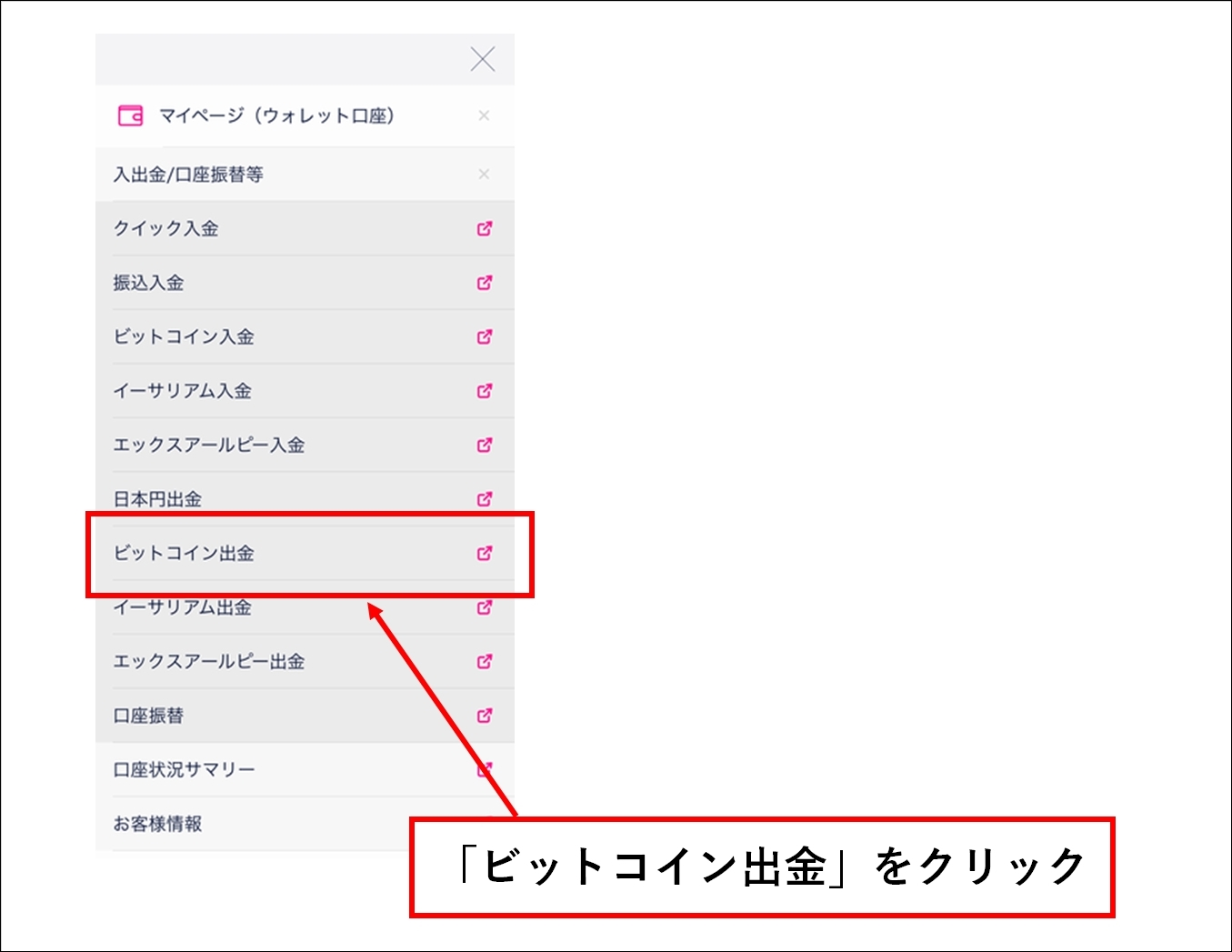 画面が展開したら、「ビットコイン出金」を選択。