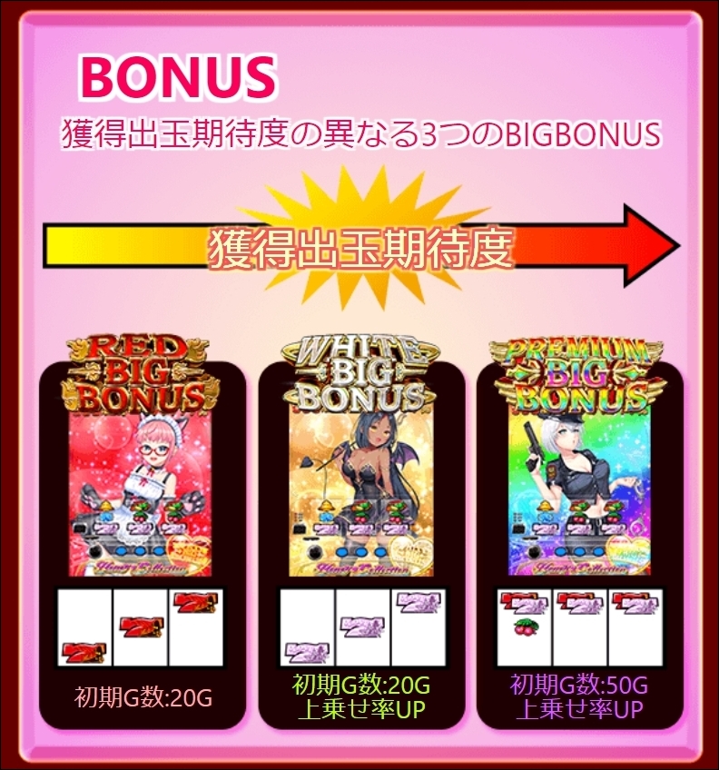 ハニーコレクションでは、獲得出玉期待度・ボーナス上乗せ率が異なる、3種類のビッグボーナスの設定があります。