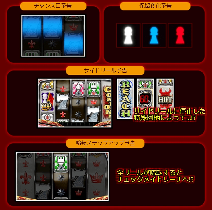 ・暗転ステップアップ予告(全リールが暗転するとチェックメイトリーチの期待大)